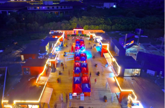 这是一条脑洞大开的集装箱市集,红蓝交错堆叠的集装箱上,绘着各种潮流涂鸦,