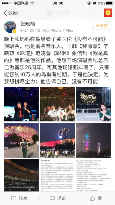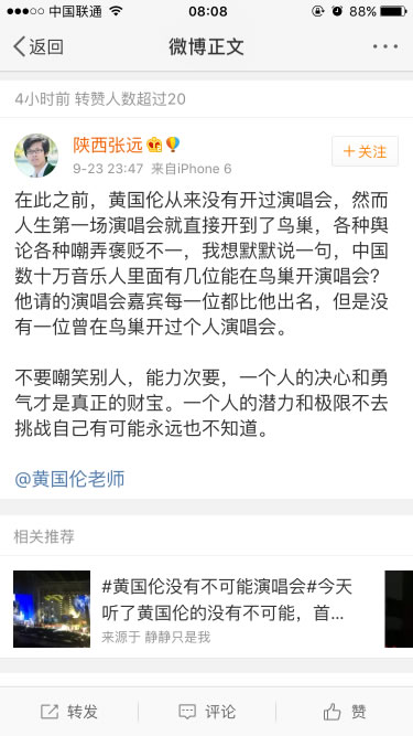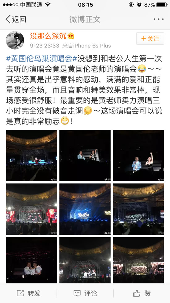 鸟巢史上最负盛名、最不可思议、最显奇迹的一场演唱会诞生了,黄国伦或将成为2017年的“励志哥”,他所带给现场几万观众,意志关注他支持他的一百多万粉丝,甚至全社会正能量把他推到了华人音乐史上的最高峰——没有不可能,只要你敢追,敢梦!