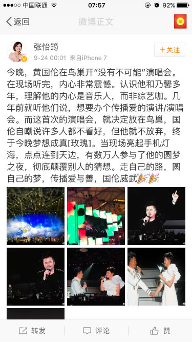 就如黄国伦自己要求的一样,任何的爱都要从小事做起,第一件事当然是环保,这场“没有不可能”演唱会现场没有荧光棒,却仍然星光熠熠,无论是粉丝、普通观众、还是明星们,都拿出了自己的手机,用自己的心意点亮了整个鸟巢,场面十分震撼。